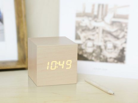 A Gingko slab click clock mutatja a pontos időt, dátumot, hőmérsékletet felváltva. Egy ideig, aztán ha minden elcsendesült már csak a fa felületet látod. A kijelző hangvezérelt, így csak csettints az ujjaddal, koppints a tetejére, vagy mellé és a ledek aktiválódnak. Természetesen folyamatos üzemmódban is használhatod, ebben az esetben 21.00 – 7.00 óra között a kijelző halványabb fényerőre vált, hogy ne zavarjon a pihenésben. Ébresztéskor a kijelző aktiválódik, érintsd meg a tetejét a szundi üzemmód bekacsolásához. Három különböző ébresztési időpont, és öt vagy hét napos ébresztési ciklus közül választhatsz. Beállításaid megőrzésének érdekében a Gingko slab click clock integrált teleppel is rendelkezik.